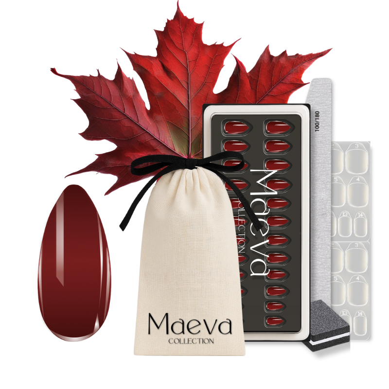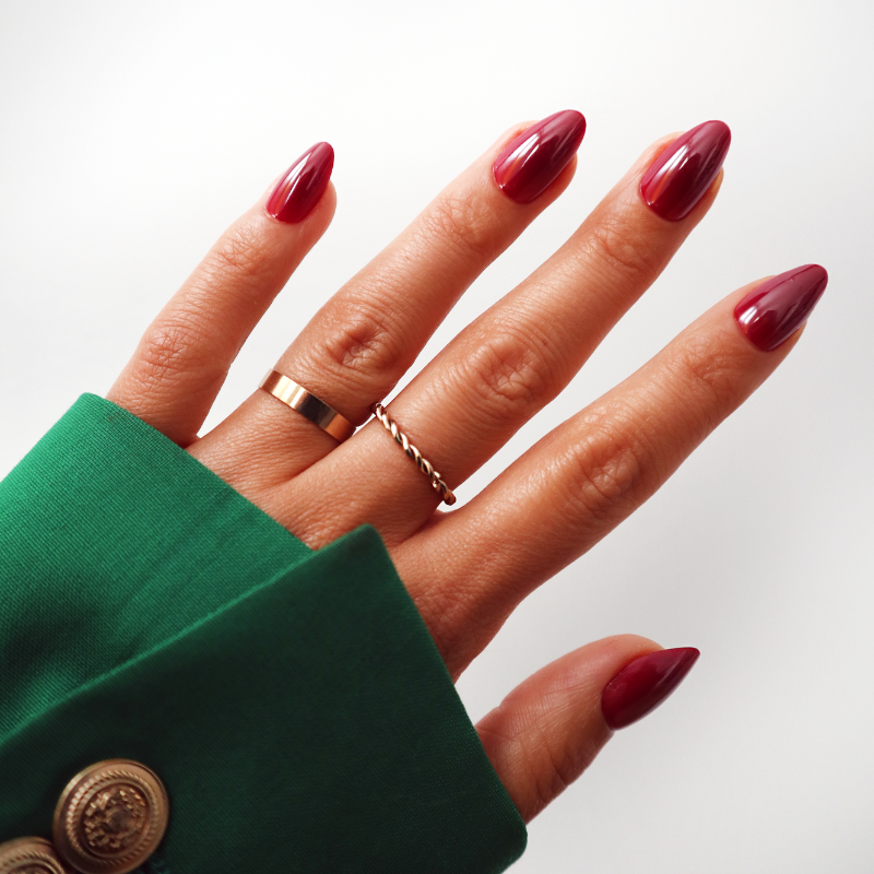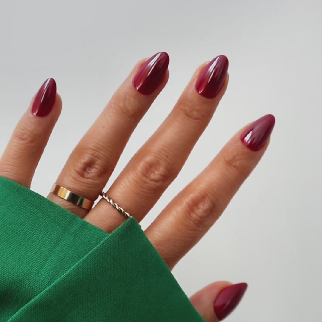 Khloé is een zachte almondvormige press-on in een rijke rode tint, afgewerkt met een uniek en elegante glans.