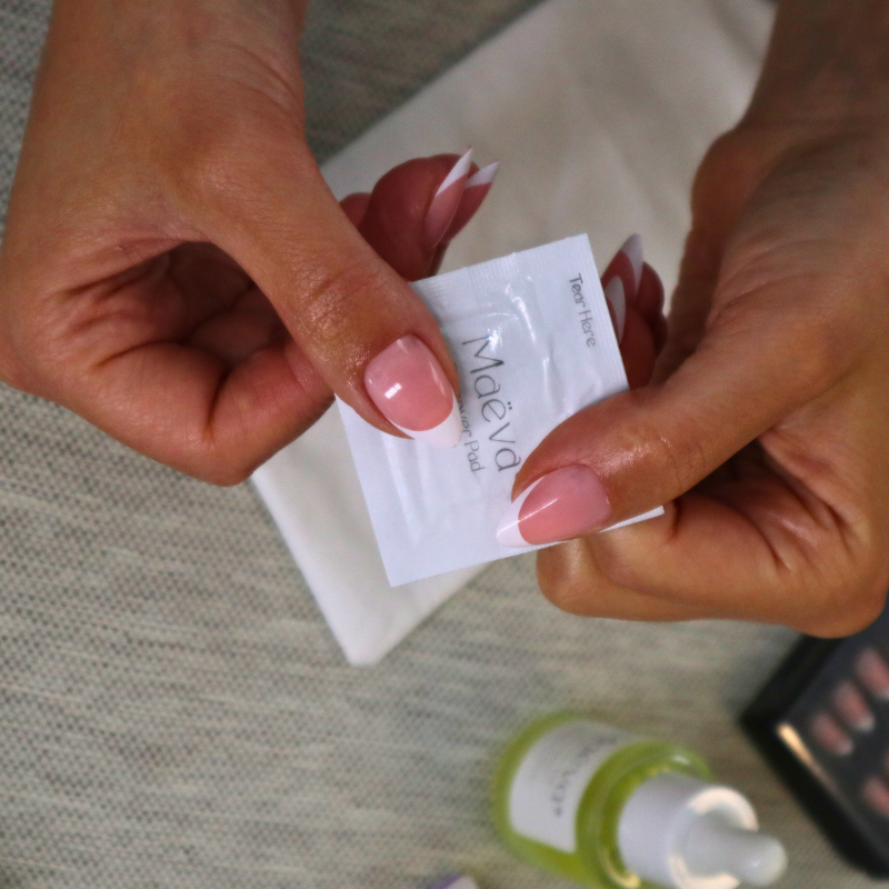 Gebruik het meegeleverde alcoholdoekje om olie en vuil van je nagels en huid te verwijderen. Doe dit altijd vóór je begint met vijlen. Alcohol (of aceton) maakt het nageloppervlak terug glad, waardoor eerdere vijlresultaten verloren gaan. Daarom is het belangrijk om eerst te reinigen en daarna pas te vijlen voor de beste grip.