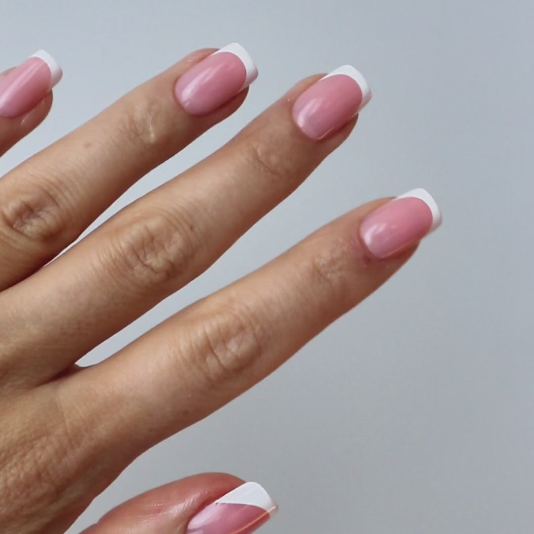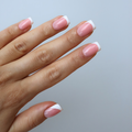 Medium Clean Cut met Lichte Peach huidskleur en French Tip. LISA is een zacht perzikkleurige ondertoon press-on nagel met een fijne french tip en een iets verlengde Clean Cut vorm.