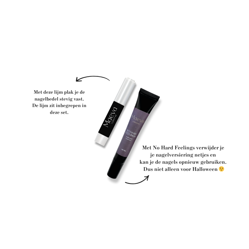 Plaats de bedel met een klein druppeltje lijm op je nagel en laat even drogen zodat hij stevig vastzit. Wil je de bedel weer verwijderen? Breng dan wat No Hard Feelings aan, laat het kort inwerken en verwijder de bedel voorzichtig. Met een doekje en wat remover haal je de lijmresten schoon weg, zonder je soft press-ons te beschadigen.Zo draag je je nagels mét versiering tijdens Halloween 🎃 … en het volgende weekend gewoon weer zonder ✨.